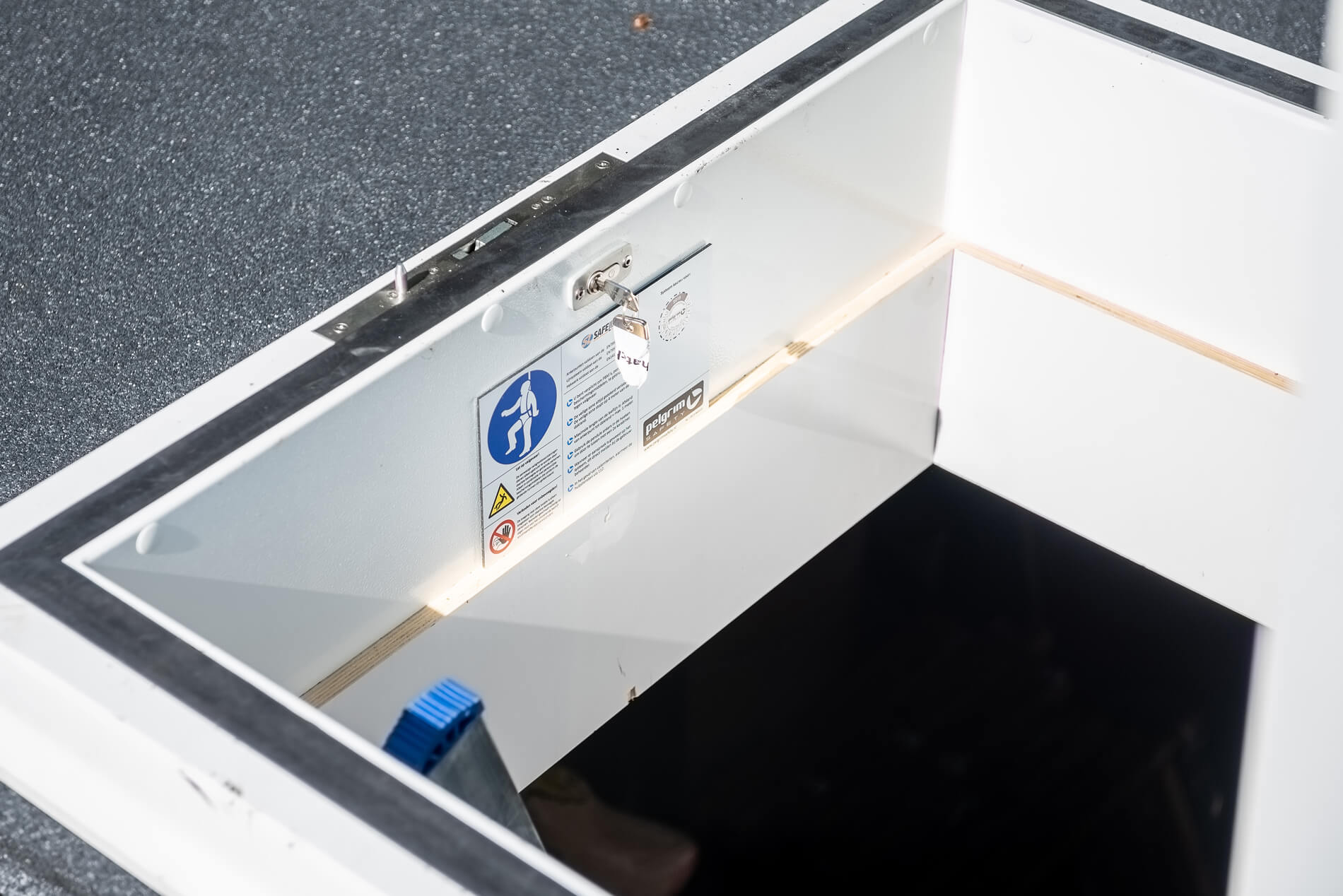 - Er is een groot dakluik gemaakt en deze is voorzien van een passende ladder met haken tegen het wegglijden.