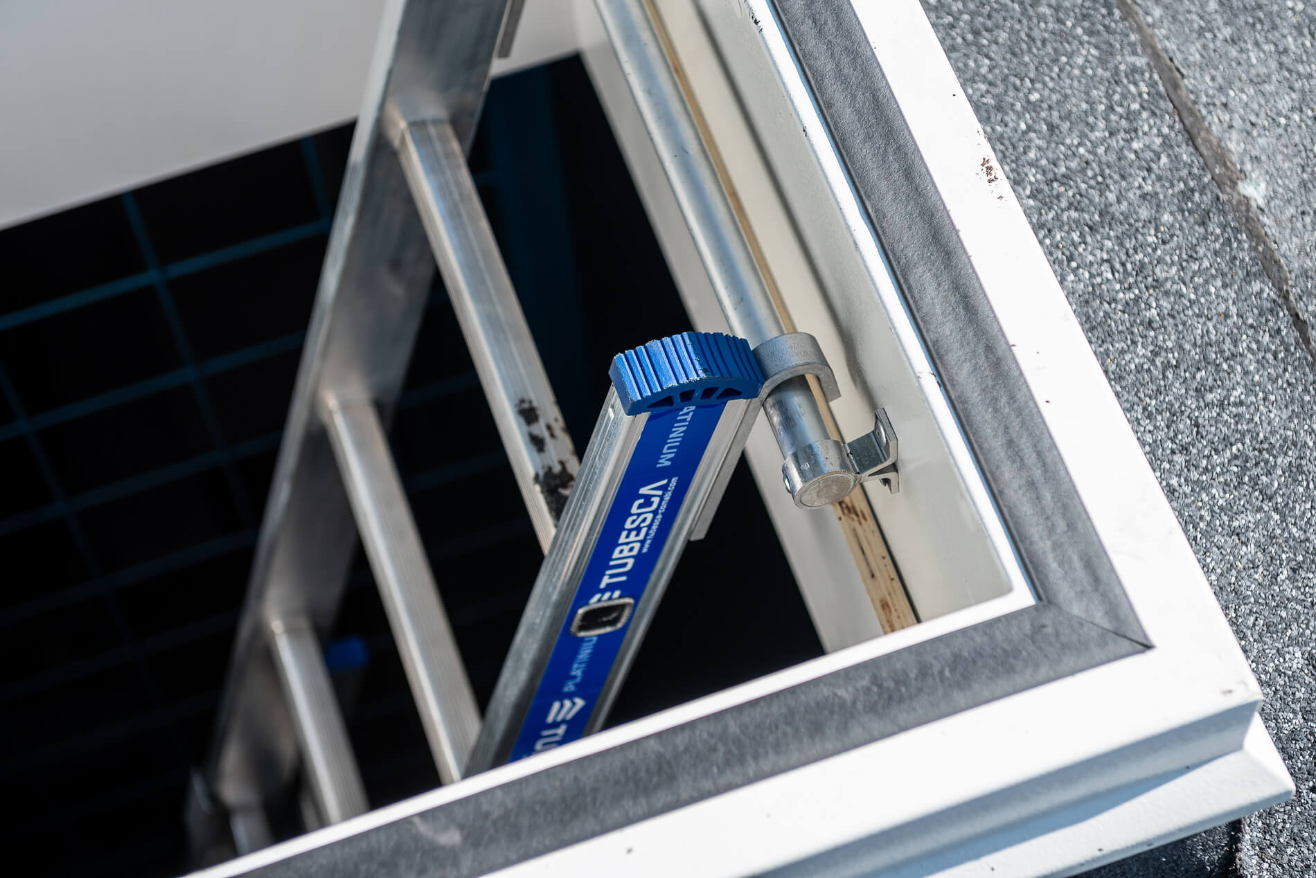 - Er is een groot dakluik gemaakt en deze is voorzien van een passende ladder met haken tegen het wegglijden.