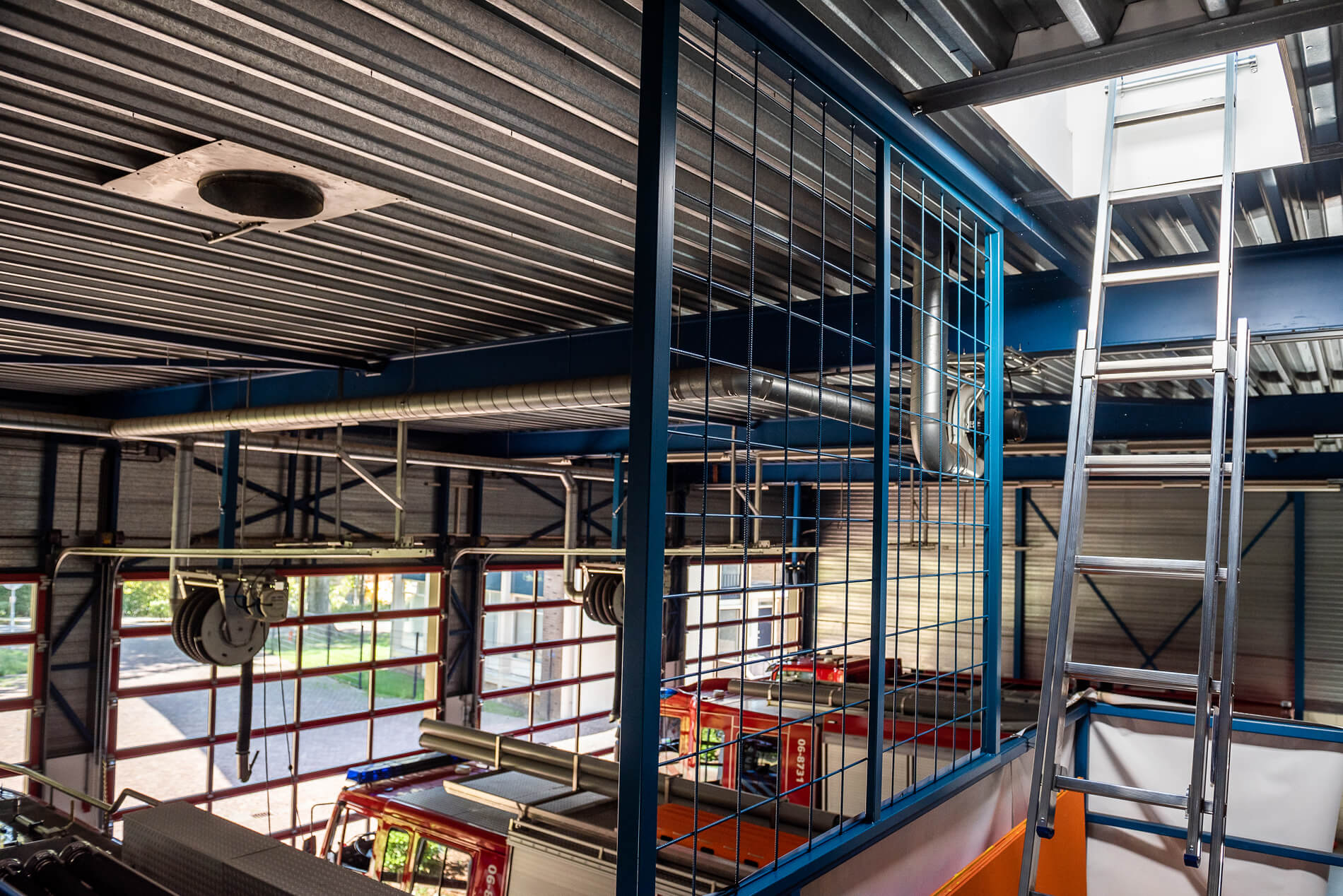 Onlangs hebben wij een installatie gemaakt op het dak van de Brandweerkazerne Montferland, post Bergh.Dankbaar voor de opdracht hebben we er iets moois van gemaakt. De vraag kwam bij ons om voor veilig onderhoud het dak te kunnen betreden.Naast gelegen bos perceel zorgt voor erg veel blad op het dak en dat is onwenselijk in de afvoeren!De installateur heeft regelmatig werk op het dak en de dakdekker ook, met hun is geïnventariseerd wat de werkzaamheden zijn, de frequentie is, en ook hoe ze het liefst willen werken.Conclusie was dat er veel waarde aan gehecht wordt aan een degelijke opgang. De werkmethodiek op het dak moet gebiedsbegrenzend zijn.Het werken aan een leeflijn was de partijen bekend en men beheerste de vaardigheid.