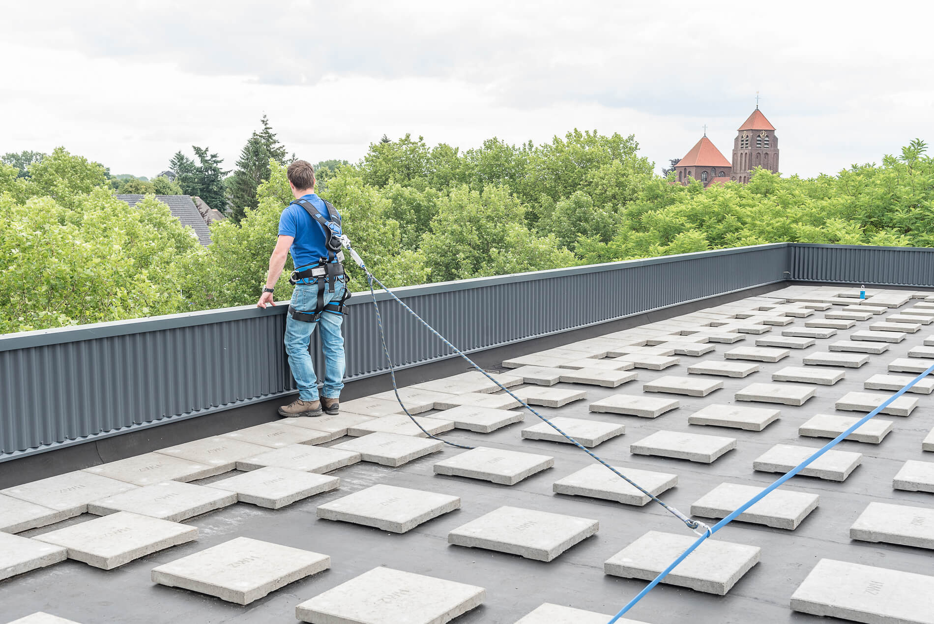 - Er is gekozen voor een SafeLine mobiel lijnsysteem conform EN795B met SafeLock EN795A anti pendule ankerpunten op de hoeken. Er mag met 3 personen tegelijk aan gewerkt worden.