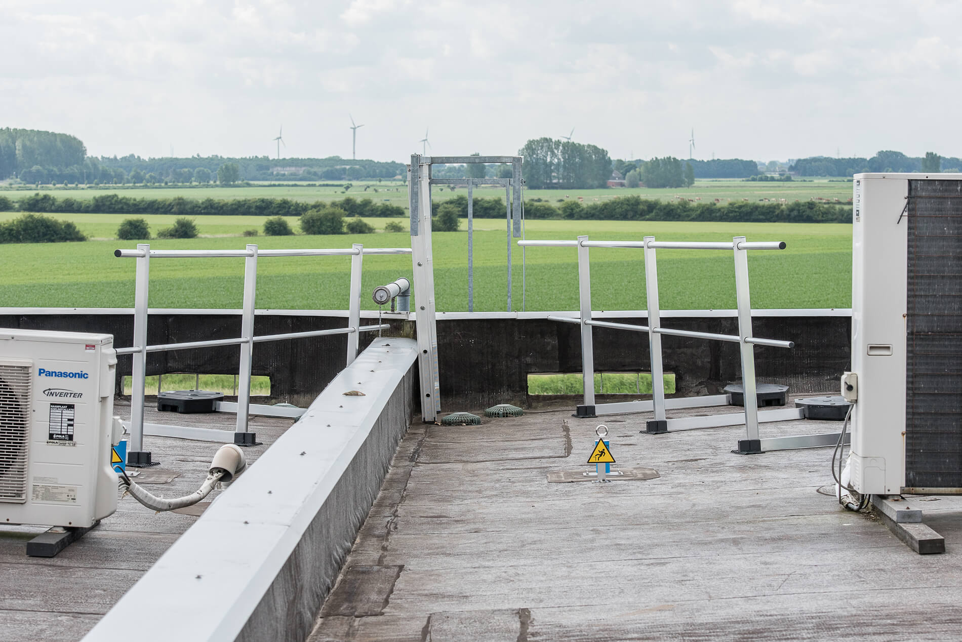 - De dakopgang is ingericht met permanent SafeRailing hekwerk tot in de veilige zone.